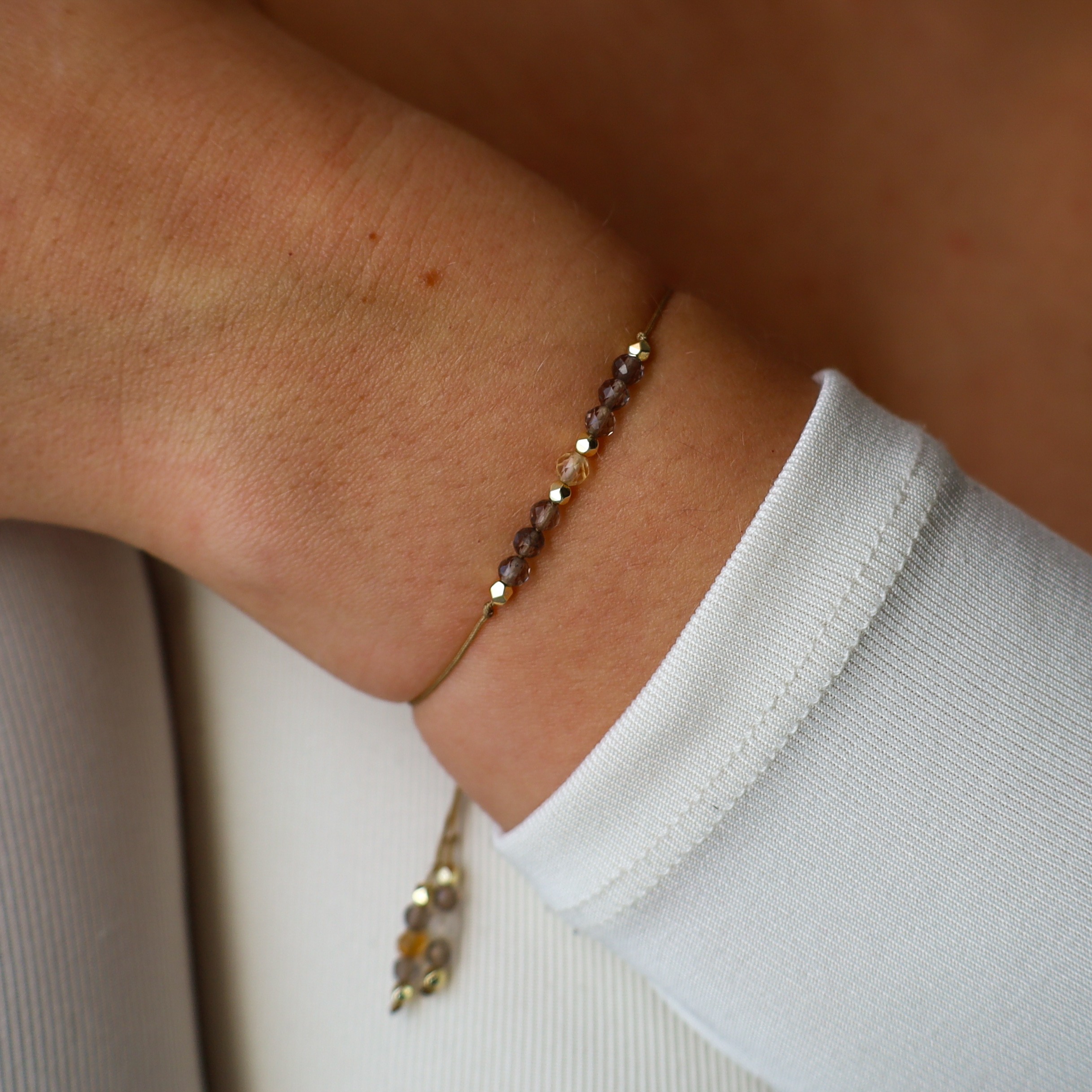 Elegancka bransoletka na sznurku łącząca kwarc dymny z cytrynem, wspierająca stabilność i jasność umysłu. Kwarc dymny pomaga w uziemieniu i radzeniu sobie ze stresem, a cytryn dodaje energii do działania i napawa optymizmem. To zestawienie stonowanego brązu i słonecznej żółci tworzy harmonijną całość, która doskonale dopełni naturalne i casualowe stylizacje.