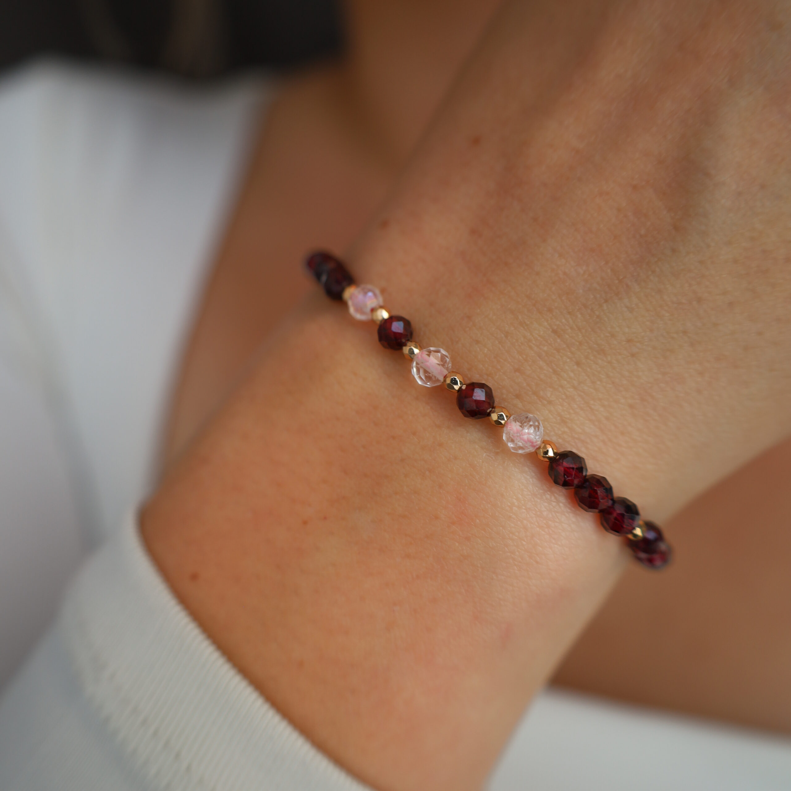 Bransoletka z granatem i kryształem górskim łączy w sobie pasję, siłę oraz wyrazistą, naturalną energię. Granat, kamień odwagi i determinacji, wspiera motywację, namiętność oraz pewność siebie, dodając noszącej go osobie mocy i wewnętrznego ognia. Kryształ górski natomiast oczyszcza, harmonizuje i wzmacnia działanie granatu, jednocześnie wprowadzając klarowność oraz świeżą, świetlistą energię. Razem tworzą niezwykle elegancki i energetyczny duet, który podkreśli indywidualny styl i doda wyjątkowego blasku każdej stylizacji.